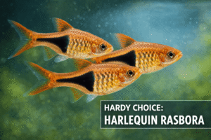 If you are worried about keeping fish alive, the Harlequin Rasbora is the fish I recommend the most. They have a copper-colored body with a black “porkchop” shape on their tail.